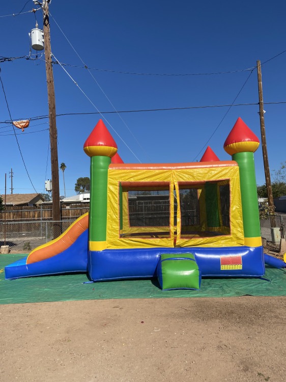 Double Slide Rainbow Castle Bounce House rental in the Phoenix/Glendale areas & surrounding cities. Dry only. A colorful inflatable packed with fun, combining a large bouncy play area and an attached slide for nonstop jumping and sliding action.