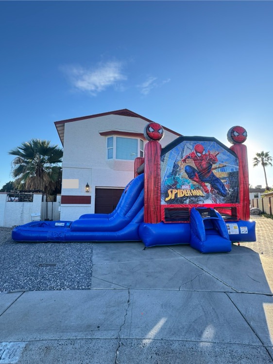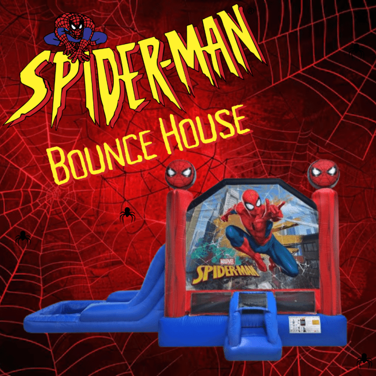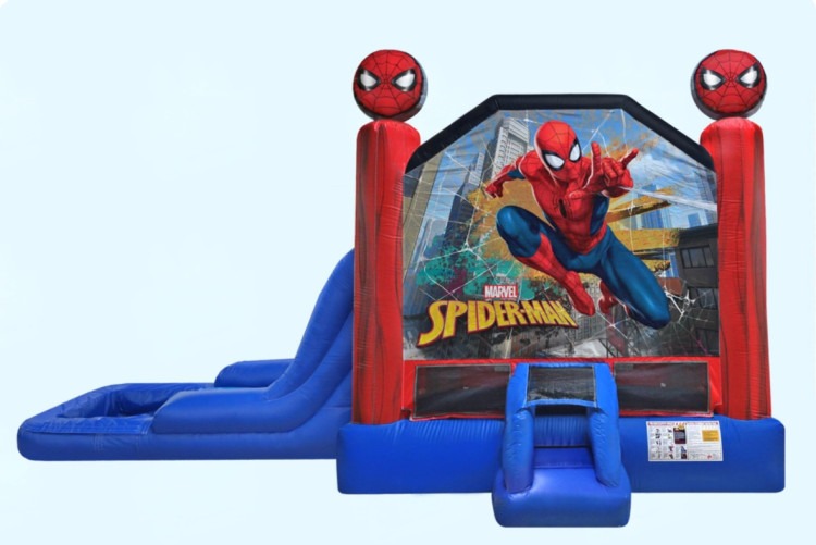 Bring the action-packed world of Spider-Man to your next party with this versatile Spider-Man Bounce House Slide Combo rental. Bright, kid-friendly graphics of the web-slinging hero cover a roomy bounce area and an attached slide, delivering hours of energetic play. Designed for both wet and dry use, the combo includes a splash-friendly option for warm days and converts quickly to a dry setup when needed, making it perfect for backyard birthdays, neighborhood gatherings, or community events. Book your Spider-Man Bounce House Rental today!
