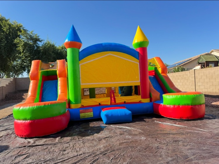 Bigger version of our side lane bouncy combos! Can be used with or without water and has a basketball hoop inside. Inflatable bounce house combo rental in the Phoenix/Glendale areas & surrounding cities with a roomy bounce area, climbing lane, and dual side slides for nonstop action.