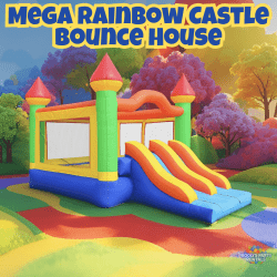 Rainbow Mega Castle Bounce HousePackage A:Rainbow Mega Castle Bounce House102973481_2976291_29598970100 Double Slide Rainbow Castle Bounce House rental in the Phoenix/Glendale areas & surrounding cities. Dry only. A colorful inflatable packed with fun, combining a large bouncy play area and an attached slide for nonstop jumping and sliding action.