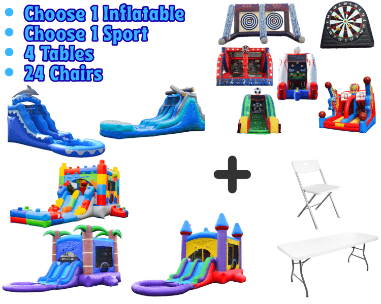 This package comes with your choice of 1 inflatable, 1 sports inflatable, 4 tables, and 24 chairs. Additional tables and chairs can be added on separately. Substitutions allowed, price difference may apply. Please contact us directly to make substitutions 480-931-0311