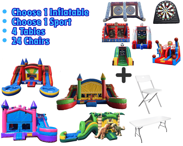This package includes your choice of 1 inflatable, 1 inflatable sport, 4 tables, and 24 chairs. Additional tables and chairs can be added on separately. Substitutions allowed, price difference may apply. Please contact us directly to make substitutions 480-931-0311
