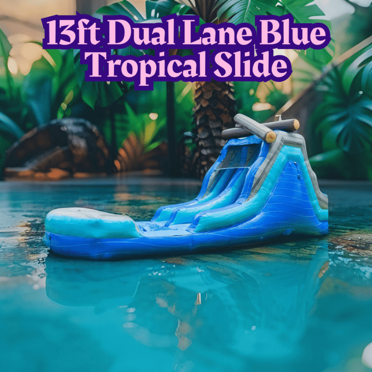 • 13ft Dual Lane Blue Tropical SlideCan be used with water or dry. Back-loader slide meaning kids climb up the ladder in the back to slide down. Pair this with our blue tropical obstacle course to make a 45ft long obstacle course rental with dual lane slides! A tall, eye-catching 13-foot dual-lane slide with a bright blue tropical theme perfect for backyard parties, school events, or any gathering that needs a splash of fun. Built for two riders to race side-by-side, its twin lanes keep the action moving and reduce waiting time, while the 13-foot height delivers an exciting but manageable drop. The tropical design with vivid blues and island-inspired accents makes it a colorful focal point that photographs well and pairs nicely with luau or summer party themes.