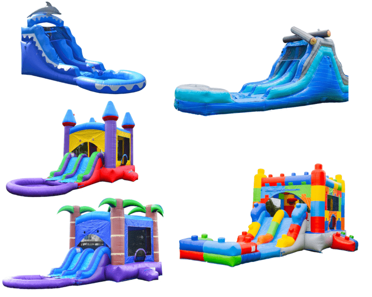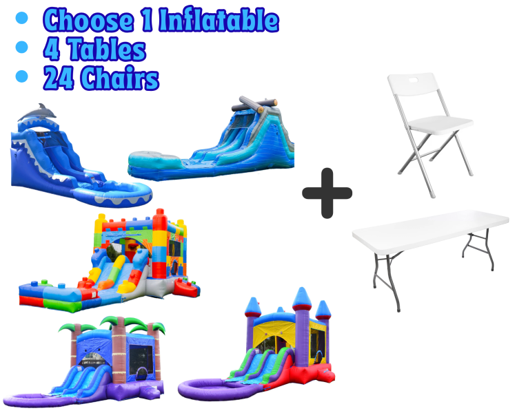 This package includes your choice of 1 inflatable option, 4 tables, and 24 chairs. Additional tables and chairs can be added separately. Substitutions allowed, price difference may apply. Please contact us directly to make substitutions 480-931-0311