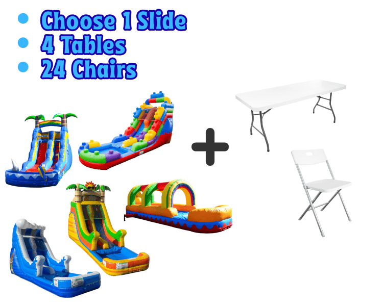 This package includes your choice of 1 slide, 4 tables, and 24 chairs. Additional tables and chairs can be added separately. Substitutions allowed, price difference may apply. Please contact us directly to make substitutions 480-931-0311