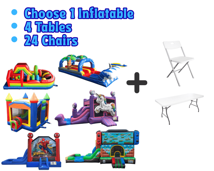 This package includes your choice of 1 inflatable, 4 tables, & 24 chairs. Additional tables & chairs can be added on separately for an additional charge. Substitutions allowed, price difference may apply. Please contact us directly to make substitutions 480-931-0311