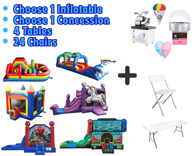 This package includes your choice of 1 inflatable, 1 concession machine, 4 tables, & 24 chairs. Additional tables & chairs can be added on separately for an extra charge. Substitutions allowed, price difference may apply. Please contact us directly to make substitutions 480-931-0311