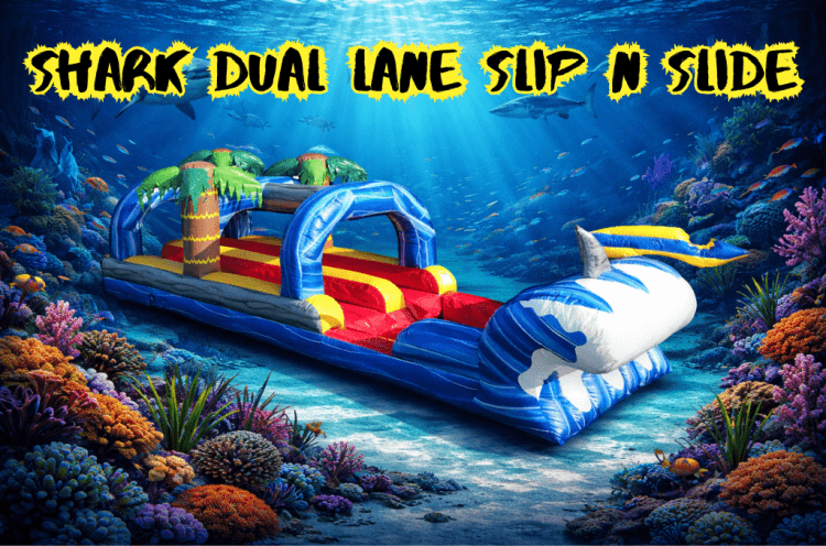 This dual lane slip n slide can also be attached to our Shark Obstacle + Bouncer to create a giant bounce house, obstacle course, and slip n slide all in one! Dive into double the fun with the Shark Dual Lane Slip N Slide rental with an attached pool at the end. This inflatable slip-and-slide features two parallel lanes so two people can race side-by-side, minimizing wait time and maximizing friendly competition. Bold shark-themed graphics and a long, glossy runway create an instant focal point — while delivering high throughput thanks to dual lanes, meaning more fun per hour for guests. The Shark Dual Lane Slip N Slide rental is a crowd-pleasing waterslide rental that combines competitive racing, safe splash landings, and nonstop summer thrills.