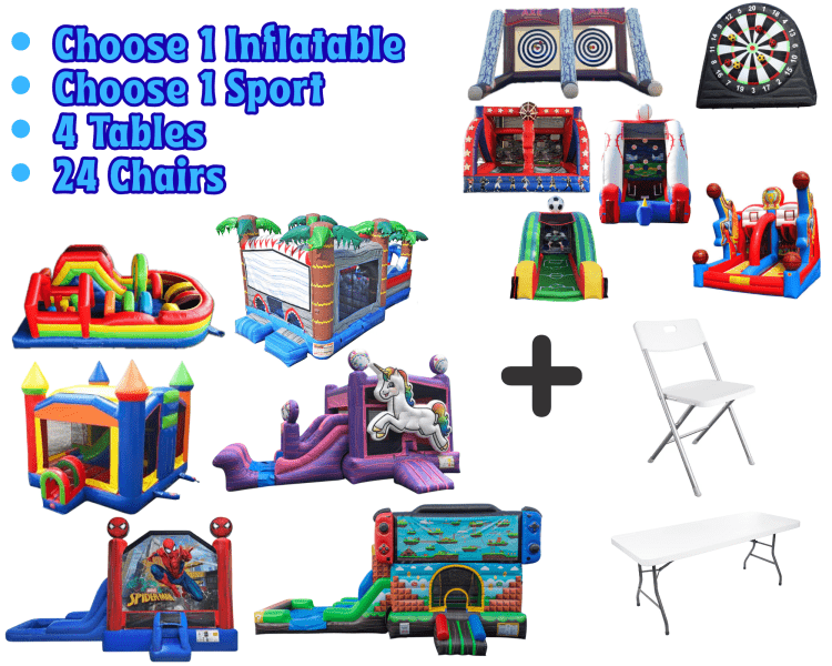 This package includes your choice of 1 inflatable, 1 sports game, 4 tables, & 24 chairs. Additional tables & chairs can be added on separately for an extra charge. Substitutions allowed, price difference may apply. Please contact us directly to make substitutions 480-931-0311