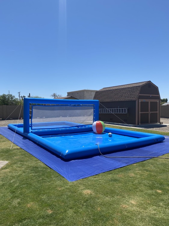 Please note this cannot be set up on dirt or rocks. Throw your own volleyball party with our inflatable volleyball court rental in the Phoenix/Glendale areas & surrounding cities! Fill up the bottom with water and have a blast! Comes with a giant beach ball and a regular sized volleyball. Even surface is best to keep the water leveled throughout.