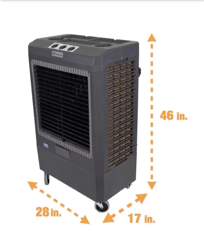 Beat this AZ heat by adding on an evaporative cooler rental in the Phoenix/Glendale areas & surrounding cities for your next outdoor event! 5,300CFM 3 speed cooler. Can cover up to a 1,600sqft space. Energy efficient only costs $0.04/hour to operate (according to manufacturer). You can attach a water hose to fill up water continuously or you can manually pour in water. 14.6 gallon water tank. Delivery fees calculated at checkout.