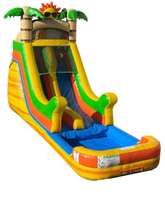 A bright 16-foot inflatable Yellow Sunrise Waterslide rental in the Phoenix/Glendale areas & surrounding cities with a sunburst design, tall climb, long slick slide and splash pool perfect for backyard parties.